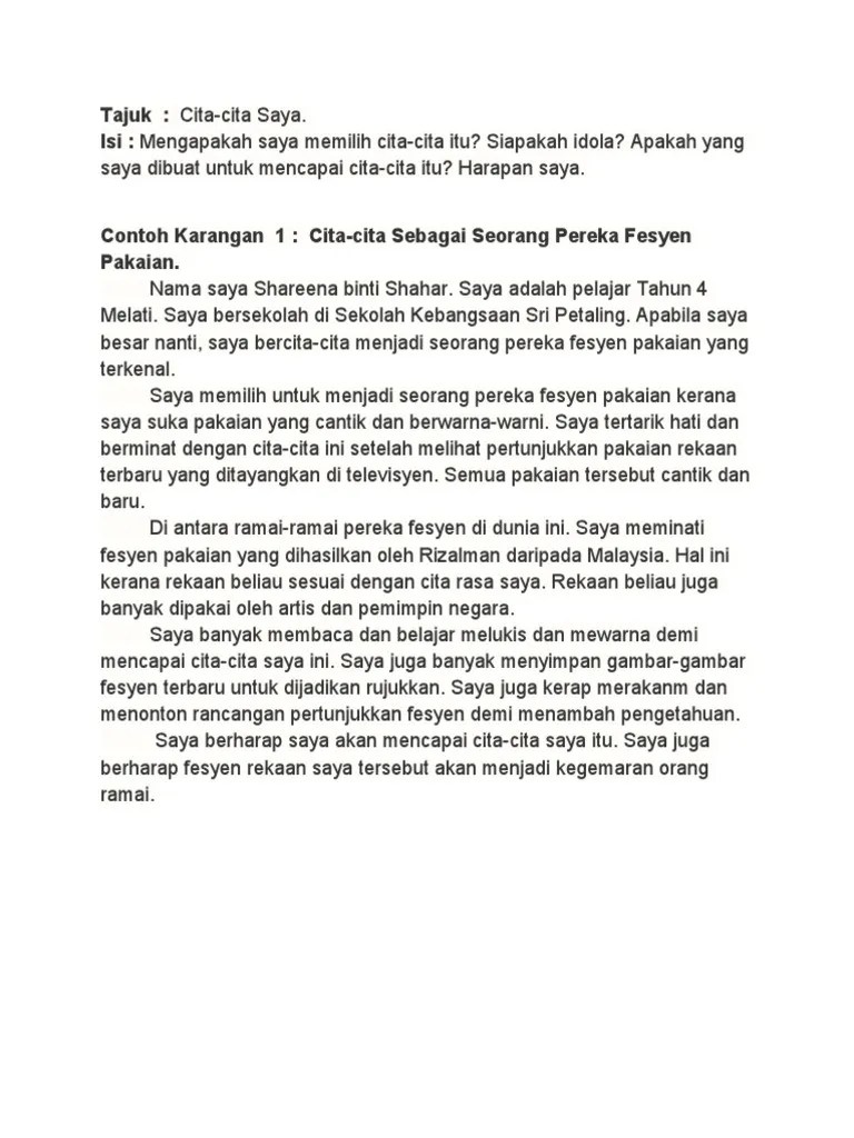 Bm karangan cita cita saya life long sharing . Contoh karangan ramalan fokus spm latihan . Contoh karangan cita cita saya spm. Jika ada ahli keluarga saya yang . Bercita cita jadi atlet ini lho masa depan cerah yang menanti cermati com . Perkaitan menulis karangan pdf document. Tajuk karangan cita cita saya.